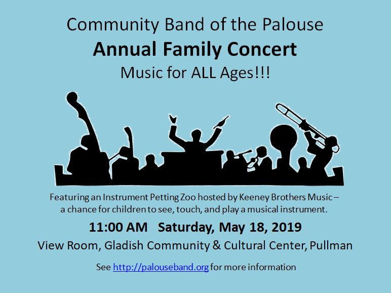 Please join the Community Band of the Palouse for our annual Family Concert on Saturday May 18 at 11AM in the View Room at Gladish Community Center. A variety of music appealing to people of all ages will be followed by our popular “musical instrument petting zoo,” hosted by Keeney Brothers Music. Children can see, touch, hear, and play band instruments. Students who will be starting 6th grade band in the fall are especially welcome to come and learn more.