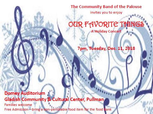 Join us Tuesday evening, December 11, 2018, 7:00 PM in the Domey Auditorium of Gladish Community and Cultural Center for some of “Our Favorite Things” – A Family Holiday Concert. Special guests include Beverly Wolff, Director of Pullman Montessori School; The Kamiak Woodwind Quintet; and Katie Berndt, Vocal Student at WSU. Music includes Leroy Anderson’s Sleigh Ride, Selections from the Sound of Music, other favorites and a reading of ‘Twas the Night Before Christmas.
