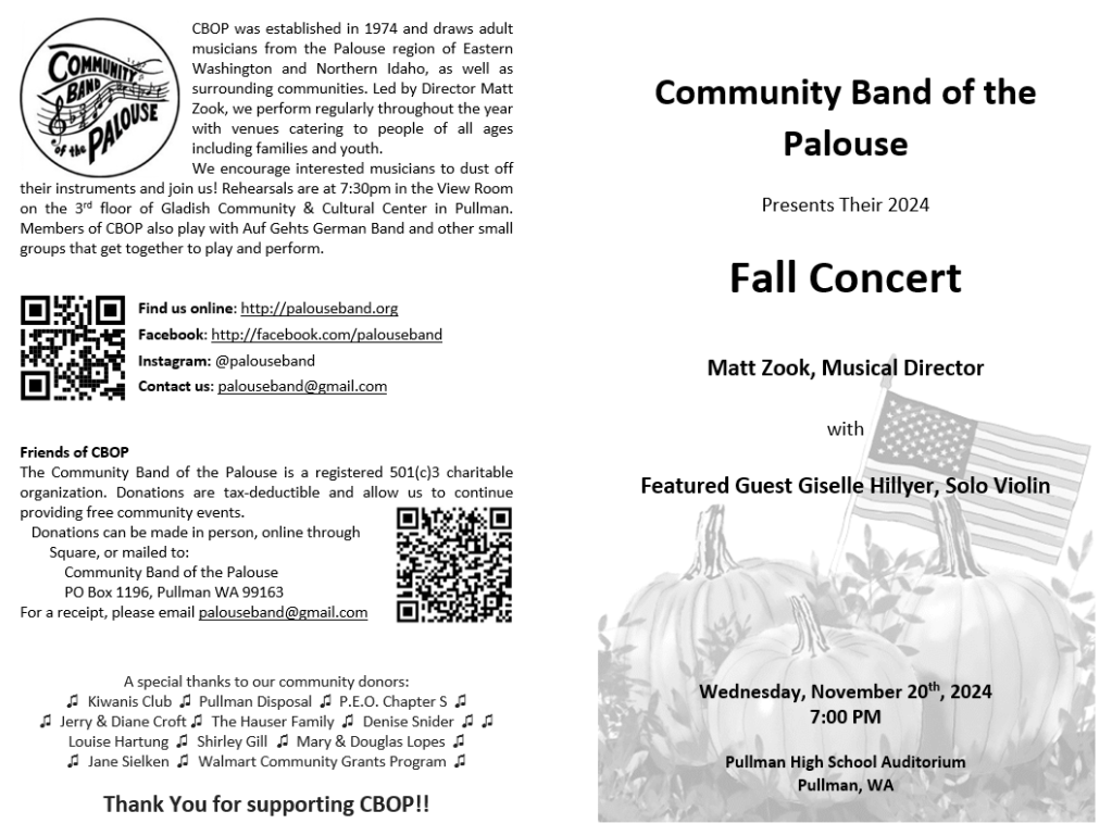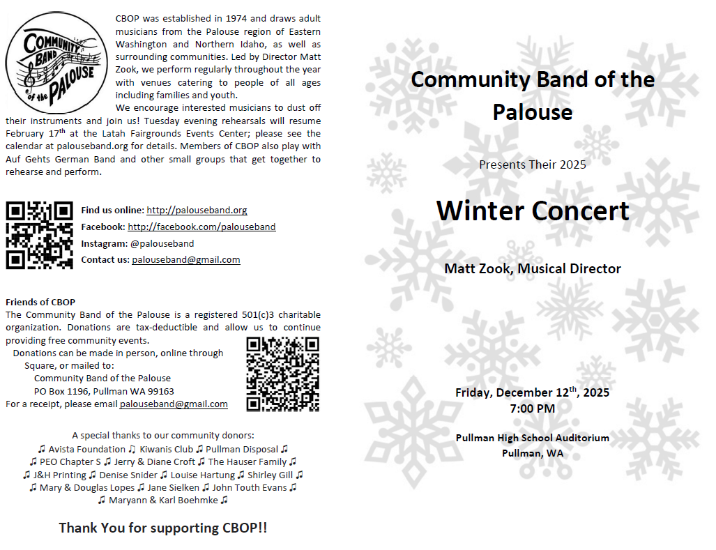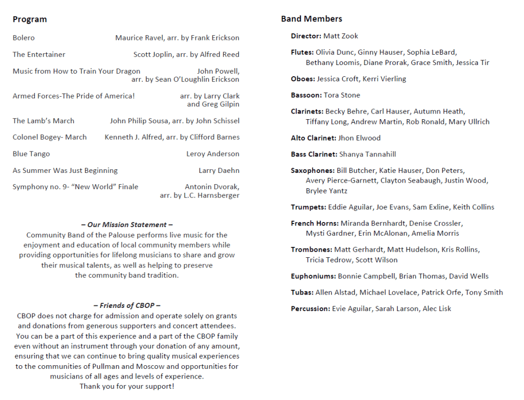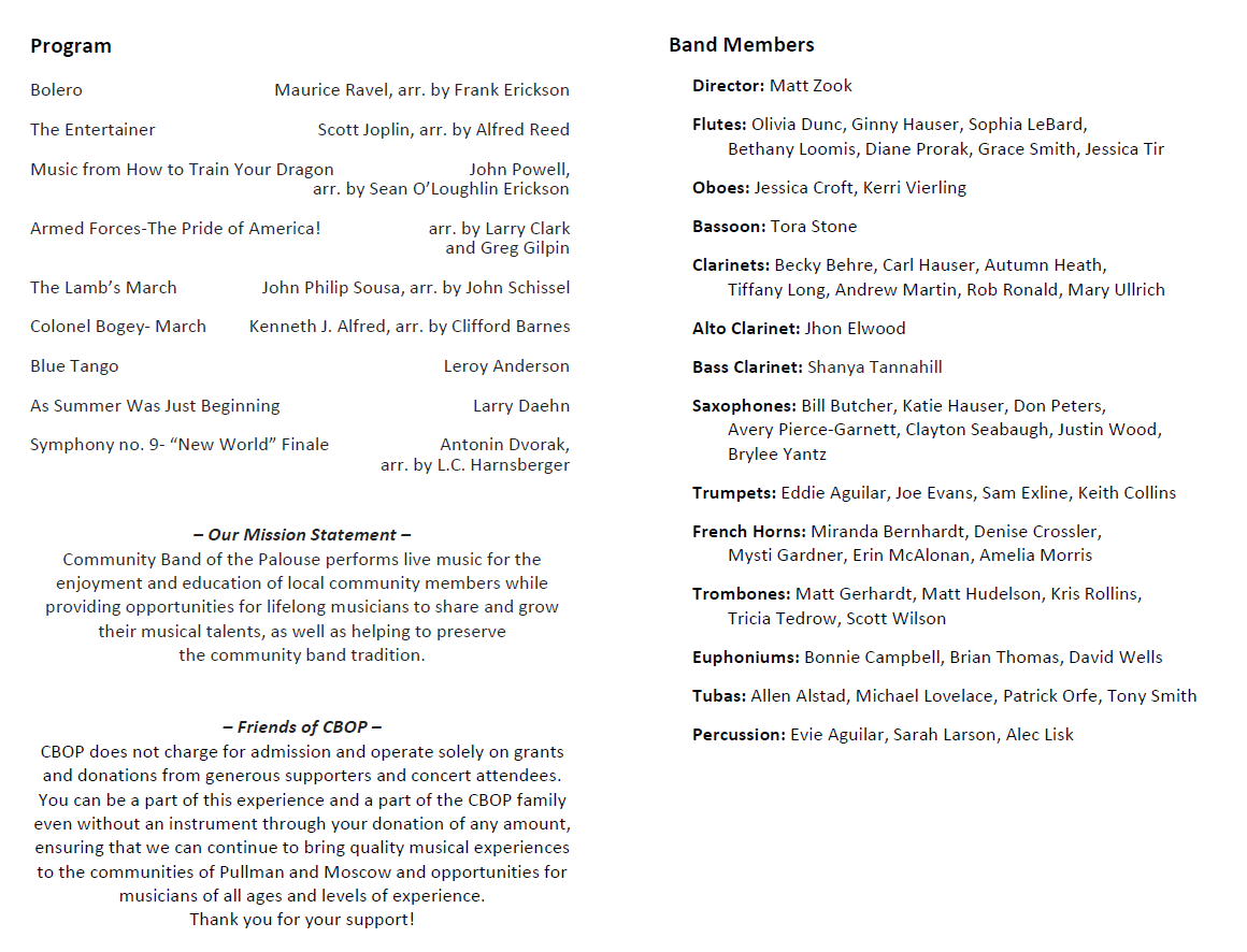 CBOP Concert Programs Winter 2025 – Fall 2025 – Fall 2024 – April 26th, 2024 Share this: Click to share on X (Opens in new window) X Click to share on Facebook (Opens in new window) Facebook Like Loading...