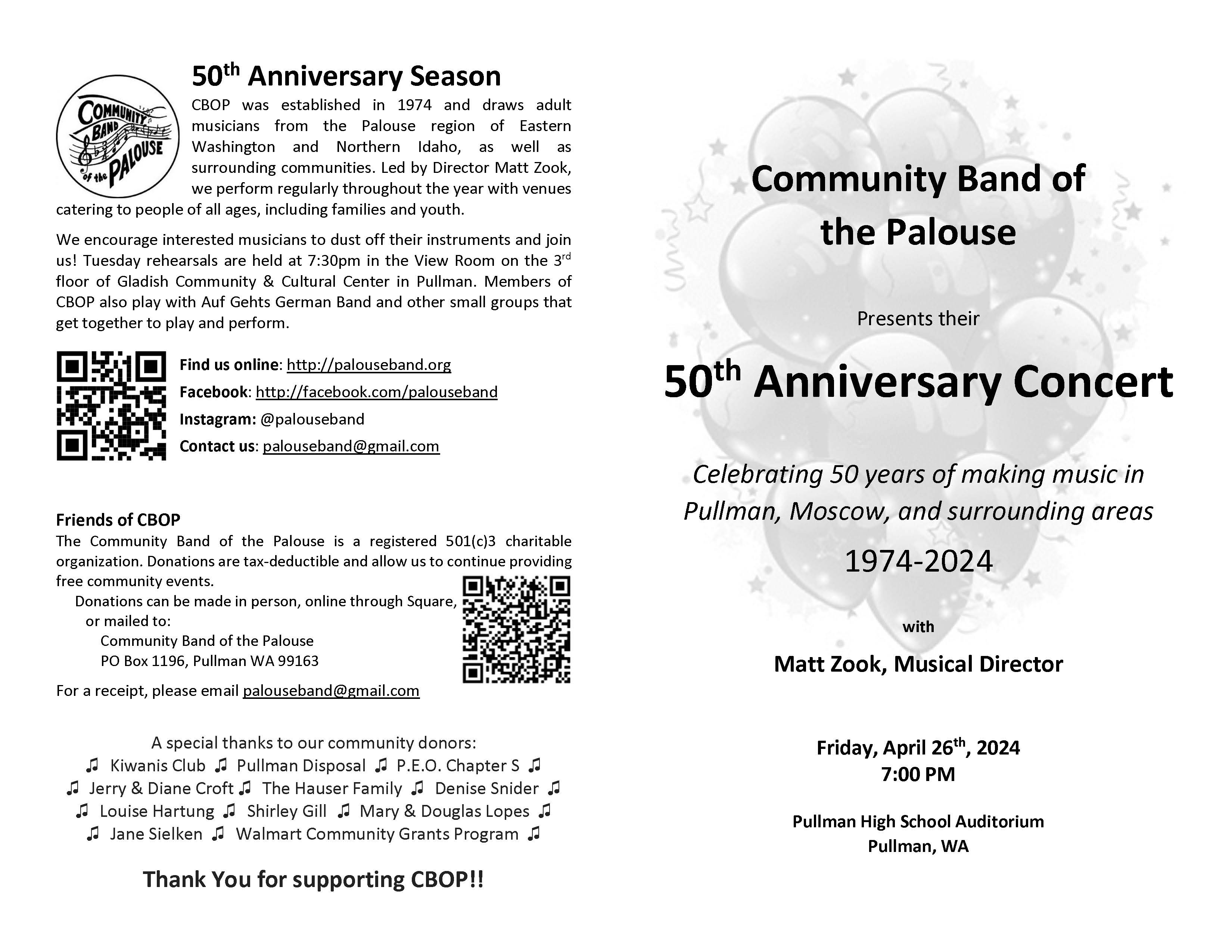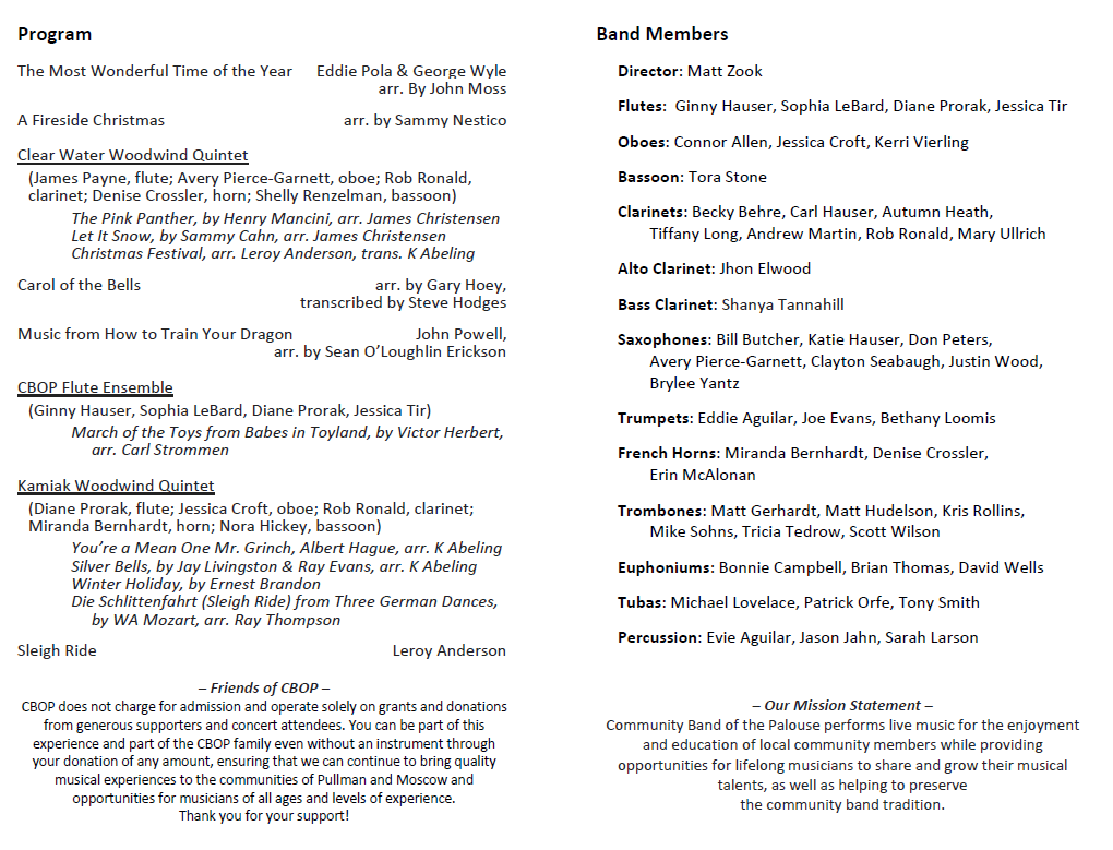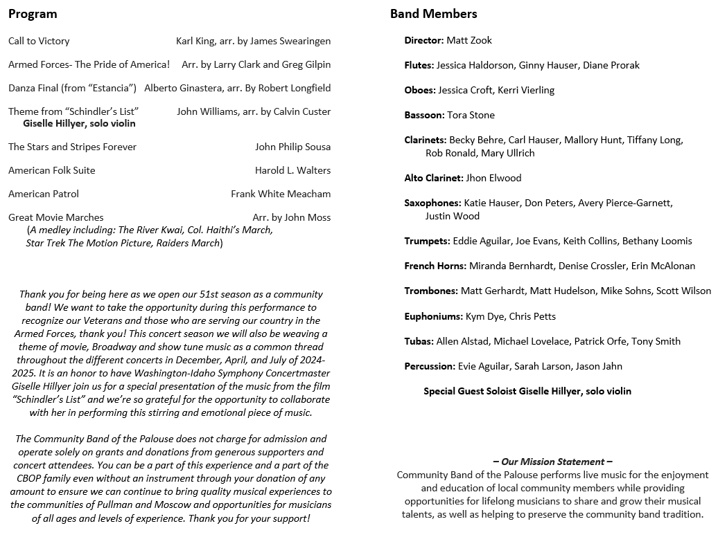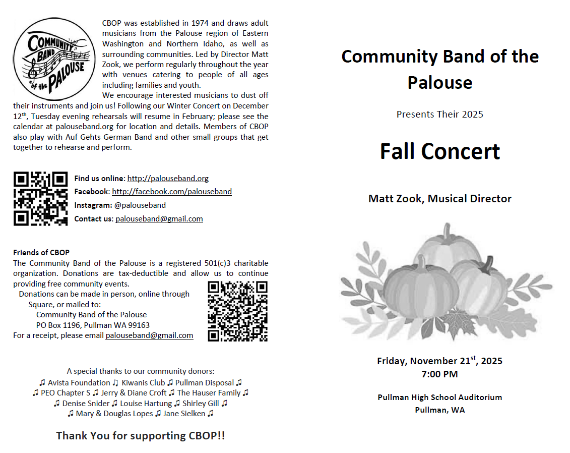 CBOP Concert Programs Winter 2025 – Fall 2025 – Fall 2024 – April 26th, 2024 Share this: Click to share on X (Opens in new window) X Click to share on Facebook (Opens in new window) Facebook Like Loading...